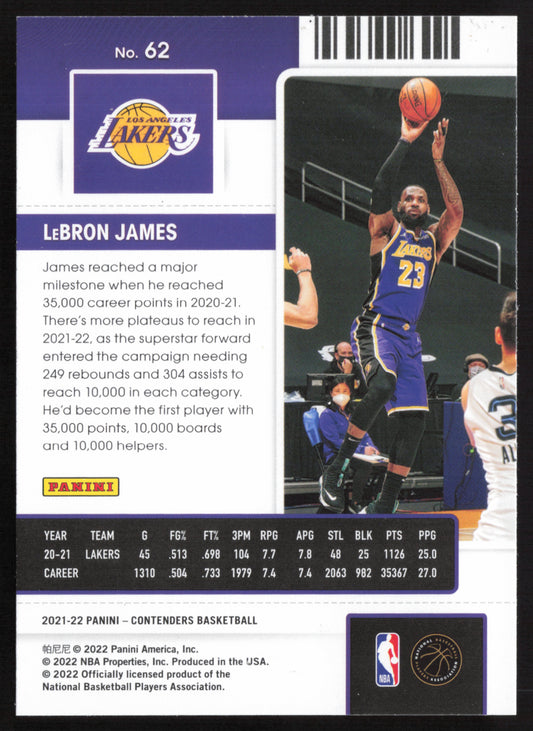 2021-2022 Panini Contenders Season Ticket #62 Lebron James Los Angeles Lakers